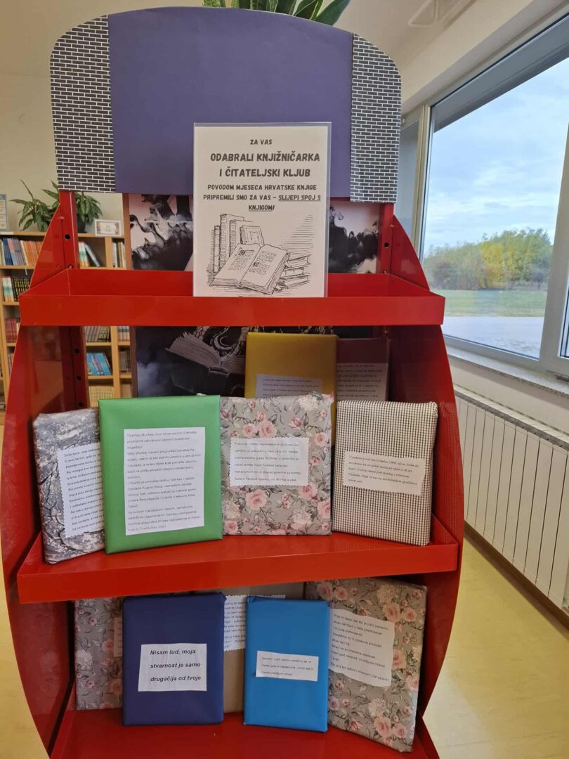 Članovi Čitateljskog kluba s knjižničarkom osmislili su aktivnost ”Slijepi spoj s knjigom” – odabrali su nekoliko naslova za niže i više razrede, zamotali knjige u ukrasni papir i na omot ispisali citat iz knjige ili kratak opis djela. Aktivnost je bila u skladu s motom ovogodišnjeg Mjeseca hrvatske knjige – ”Odabrali knjižničari”, a cilj joj je potaknuti učenike na čitanje knjiga u slobodno vrijeme, prema slobodnom izboru, nevezano za obaveznu lektiru.