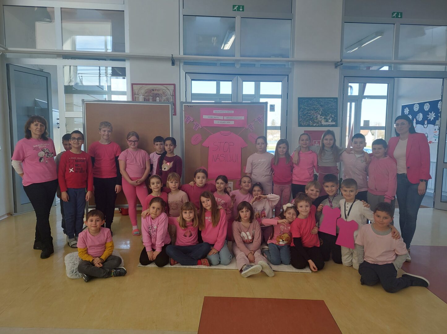 Učenici i učitelji odjenuli su ružičaste majice u znak podrške borbi protiv nasilja te su se zajednički fotografirali ispred prigodno uređenog panoa.