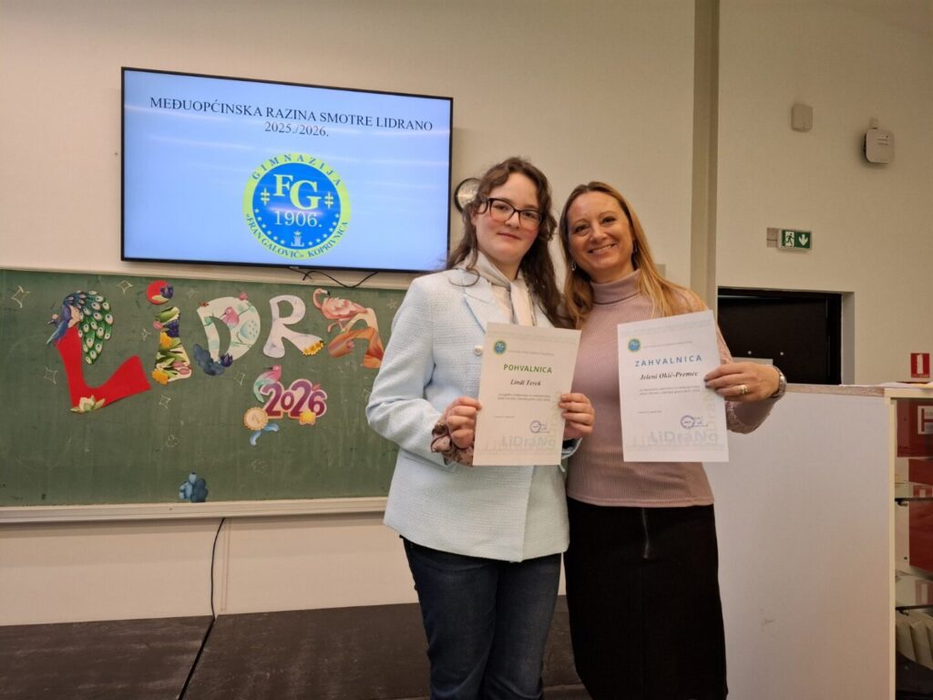 U ponedjeljak, 2. veljače 2026. godine, u prostoru Gimnazije “Fran Galović” održana je međuopćinska smotra LiDraNo. Na smotri je sudjelovala učenica 5. razreda Linda Terek u kategoriji dramsko-scensko stvaralaštvo – pojedinačni scenski nastup, osnovna škola.